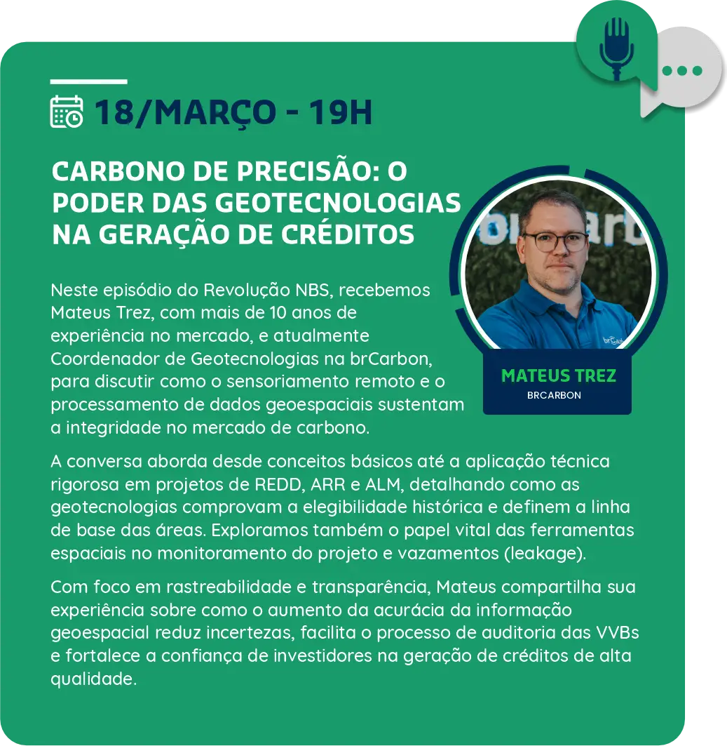A cada episódio, especialistas proporcionam aos participantes uma visão abrangente e atualizada, preparando-os para enfrentar os desafios e aproveitar as oportunidades no campo das soluções baseadas na natureza. Confira em sua plataforma preferida.